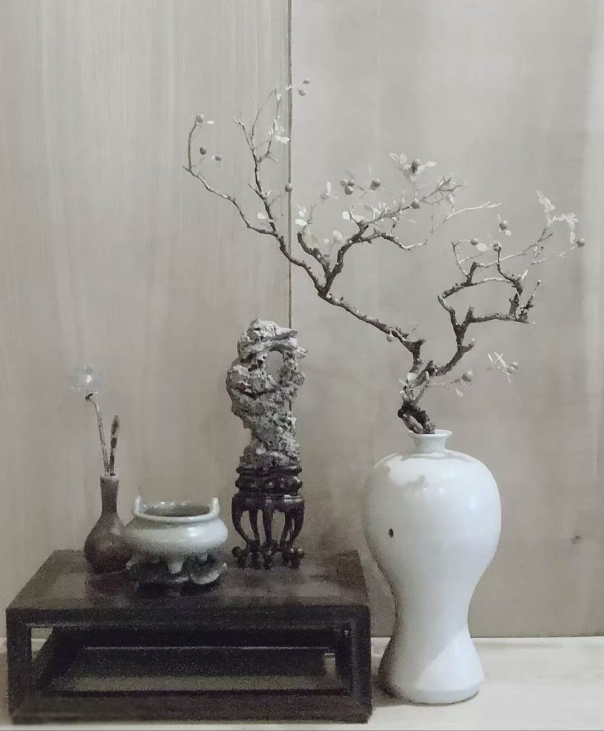 - 奇枝斜倚插:梅瓶斜插千里香枯枝一枝,取“奇正相生”之意,枝影映壁如澹墨山水。