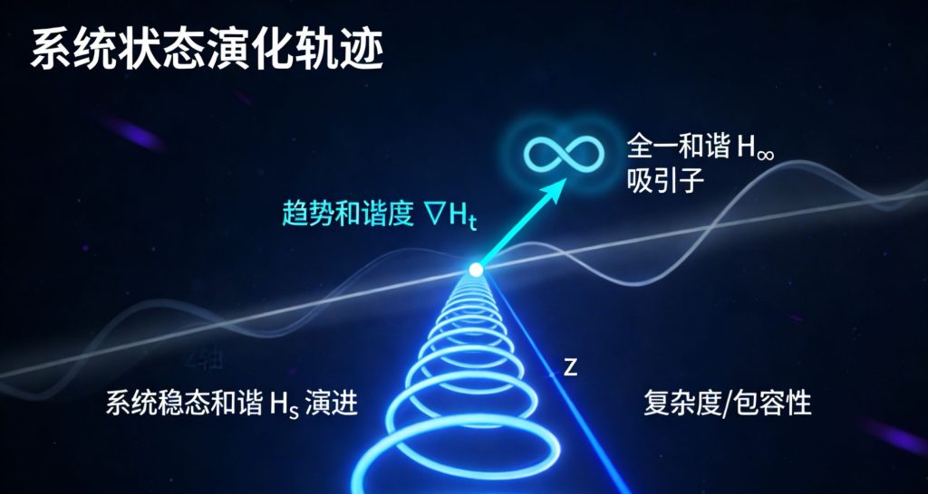 · 推导:此锚点必须(1)本身是稳定、无内在矛盾的(呼应 推论1);(2)能提供化解系统内部及系统与环境间冲突的导向性原则。这要求锚点必须高于且能包容冲突各方。我们将具备此属性的锚点暂称为 “和谐”,并将其操作化为:引导系统状态向更具包容性、韧性及复杂性的动态平衡演进的方向(即“趋势和谐度∇H_t”为正)。