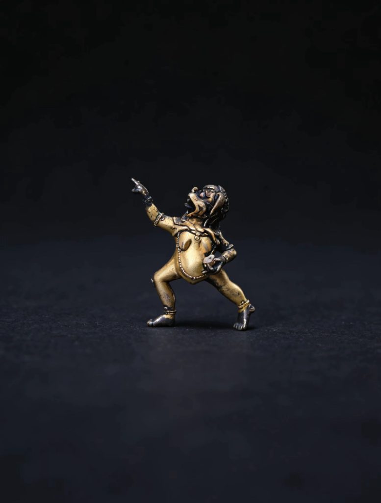 狮面张口,鬃毛飞扬,不是凶厉,是无畏的觉醒——忿怒相里藏着最直白的密意:以威猛击碎无明,以震慑唤醒清明。右手指天,左执法器,弓步而立的舞姿里,每一寸肌肉都绷着破执的力量,动是乐空不二的示现,静是觉悟当下的笃定。