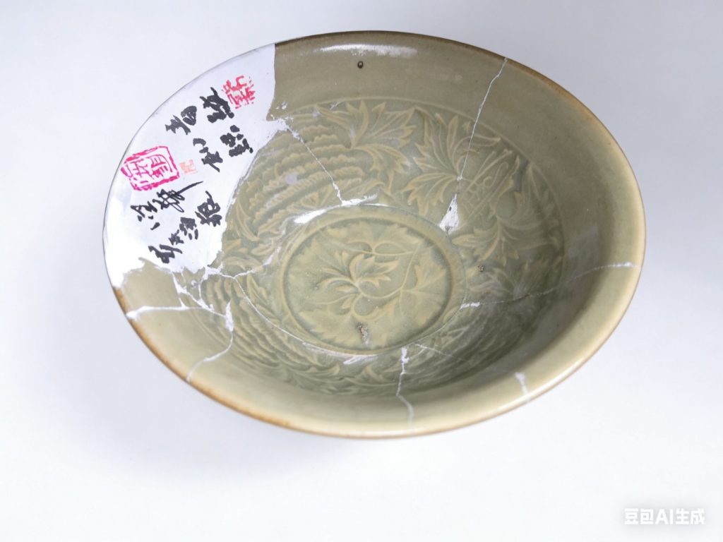 此碗为北宋耀州窑遗器,敞口斜壁,形如斗笠,青釉泛黄如橄榄,釉面细碎开片,似冰纹轻覆。内壁以耀州窑标志性“半刀泥”刻法,雕缠枝牡丹纹,刀笔刚劲利落,如剑刃斩泥,花瓣层叠舒展,枝蔓缠绕若织,故名“青纹如织”。虽有残损,碗身裂璺纵横,以素料补全,裂痕反成时光之笔,恰合“空華”之旨——万象如幻,而道心与光阴之迹,终不可灭。以补白为纸,题曰:青紋如织 岁月留痕 空華