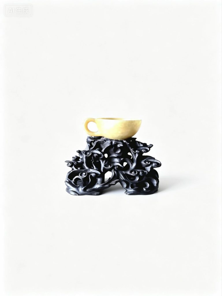 昔年先藏玉杯,数载之后方遇此檀座。岁月辗转,双物相逢,浑然合一。沉穆紫檀为衬,愈衬玉杯莹润通灵;以玉芝为核心,群芝环簇相拥,题材同源,工法同调,气韵相通,宛若一丛幽谷千年灵芝,静现案前。
